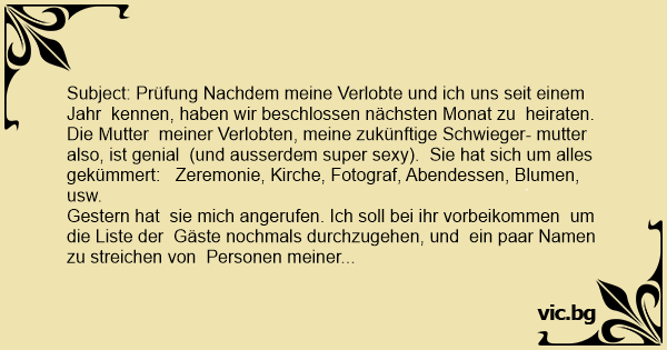 Subject: Prüfung Nachdem meine Verlobte und ich uns seit einem Jahr kennen, haben wir beschlossen nächsten Monat zu heiraten.