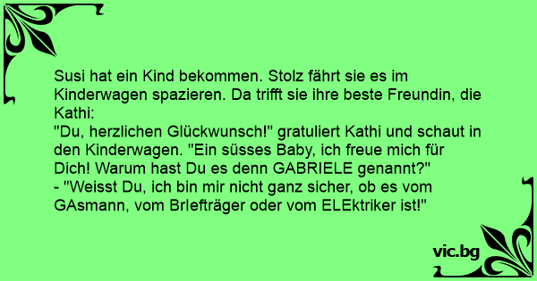 "Du, herzlichen Glückwunsch!" gratuliert Kathi und schaut in den Kinderwagen. "Ein süsses Baby, ich freue mich für Dich! Warum hast Du es denn GABRIELE genannt?"