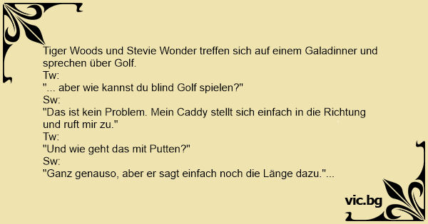 Tiger Woods und Stevie Wonder treffen sich auf einem Galadinner und sprechen über Golf.