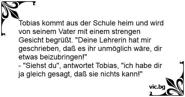 Tobias kommt aus der Schule heim und wird von seinem Vater mit einem strengen Gesicht begrüßt. "Deine Lehrerin hat mir geschrieben, daß es ihr unmöglich wäre, dir etwas beizubringen!"