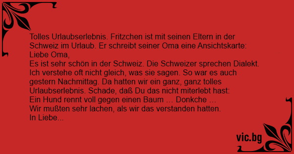 Tolles Urlaubserlebnis. Fritzchen ist mit seinen Eltern in der Schweiz im Urlaub. Er schreibt seiner Oma eine Ansichtskarte: