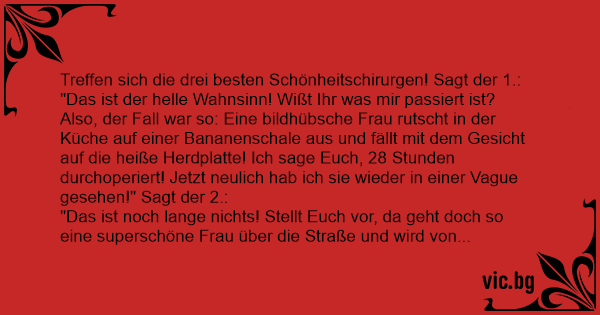 Also, der Fall war so: Eine bildhübsche Frau rutscht in der Küche auf einer Bananenschale aus und fällt mit dem Gesicht auf die heiße Herdplatte! Ich sage Euch, 28 Stunden durchoperiert! Jetzt neulich hab ich sie wieder in einer Vague gesehen!" Sagt der 2.: