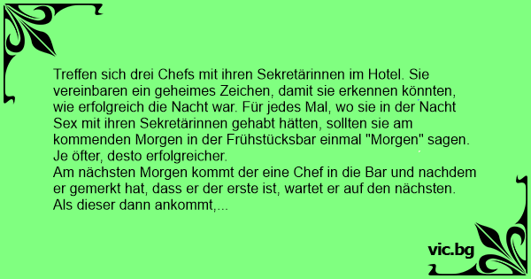 Treffen sich drei Chefs mit ihren Sekretärinnen im Hotel. Sie vereinbaren ein geheimes Zeichen, damit sie erkennen könnten, wie erfolgreich die Nacht war. Für jedes Mal, wo sie in der Nacht Sеx mit ihren Sekretärinnen gehabt hätten, sollten sie am kommenden Morgen in der Frühstücksbar einmal "Morgen" sagen. Je öfter, desto erfolgreicher.