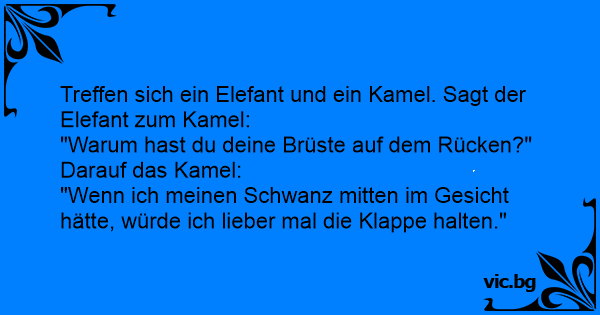 Treffen sich ein Elefant und ein Kamel in der Wüste. Sagt der Elefant:,Wieso hast du Titten auf dem Rücken?’’ Dagegen das Kamel: ,Wieso hast du einen Pimmel mitten im Gesicht?’’