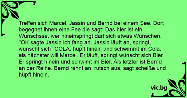Treffen sich Marcel, Jassin und Bernd bei einem See. Dort begegnet ihnen eine Fee die sagt: Das hier ist ein Wunschsse, wer hineinspringt darf sich etwas Wünschen. "OK sagte Jassin ich fang an. Jassin läuft an, springt, wünscht sich "COLA, hüpft hinein und schwimmt im Cola. als nächster will Marcel. Er läuft, springt wünscht sich Bier. Er springt hinein und schwimt im Bier. Als letzter ist Bernd an der Reihe. Bernd rennt an, rutsch aus, sagt sсhеißе und hüpft hinein.