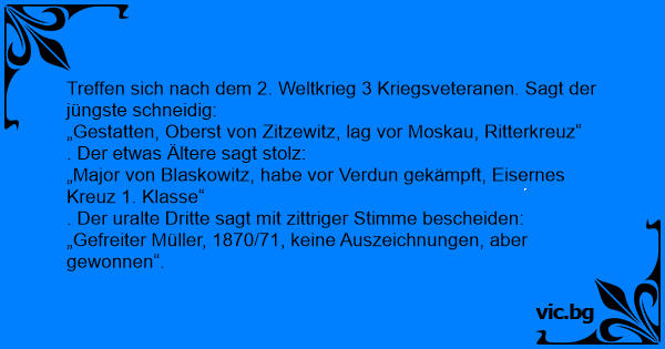 Treffen sich nach dem 2. Weltkrieg 3 Kriegsveteranen. Sagt der jüngste schneidig:
