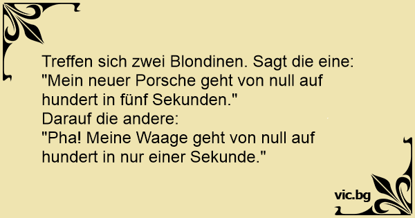 Kommt meine Frau heute in den Garten nachdem sie den neuen BMW der Nachbarin erblickt hat: "Du, Hans, ich brauch auch so ein Ding mit dem ich innerhalb von fünf Sekunden auf Hundert komme!" "Naja, so habe ich ihr eine Badzimmerwaage gekauft..."