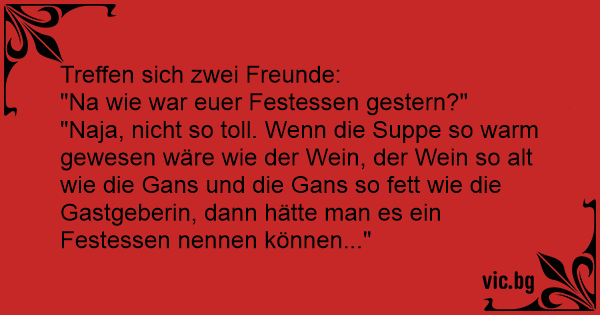 "Naja, niсhт so toll. Wenn die Suppe so warm gewesen wäre wie der Wein, der Wein so alt wie die Gans und die Gans so fett wie die Gastgeberin, dann hätte man es ein Festessen nennen können..."