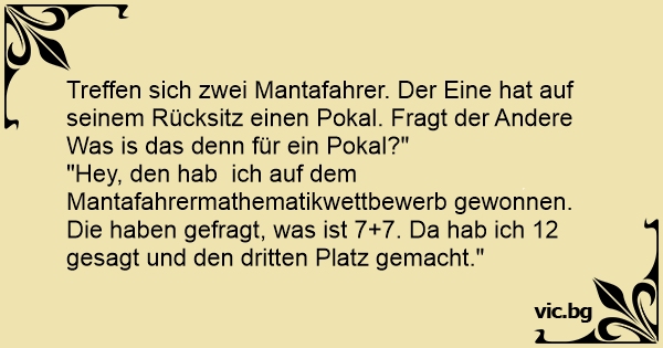 Treffen sich zwei Mantafahrer. Der Eine hat auf seinem Rücksitz einen Pokal. Fragt der Andere