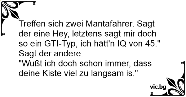 Treffen sich zwei Mantafahrer. Sagt der eine Hey, letztens sagt mir doch so ein GTI-Typ, ich hätt'n IQ von 45."