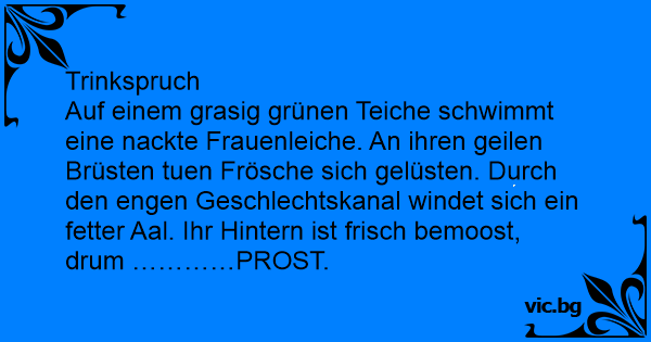 Auf einem grasig grünen Teiche schwimmt eine nackte Frauenleiche. An ihren geilen Brüsten tuen Frösche sich gelüsten. Durch den engen Geschlechtskanal windet sich ein fetter Aal. Ihr Hintern ist frisch bemoost, drum …………PROST.