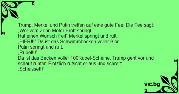 Trump, Merkel und Putin treffen auf eine gute Fee. Die Fee sagt: „Wer vom Zehn Meter Brett springt Hat einen Wunsch frei!“ Merkel springt und ruft: „BIER!!!“ Da ist das Schwimmbecken voller Bier. Putin springt und ruft: „Rubel!!!“ Da ist das Becken voller 100Rubel-Scheine. Trump geht vor und schaut runter. Plötzlich rutscht er aus und schreit: „Sсhеissе!!!“