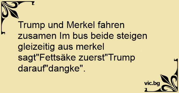 Trump und Merkel fahren zusamen Im bus beide steigen gleizeitig aus merkel sagt"Fettsäke zuerst"Trump darauf"dangke".