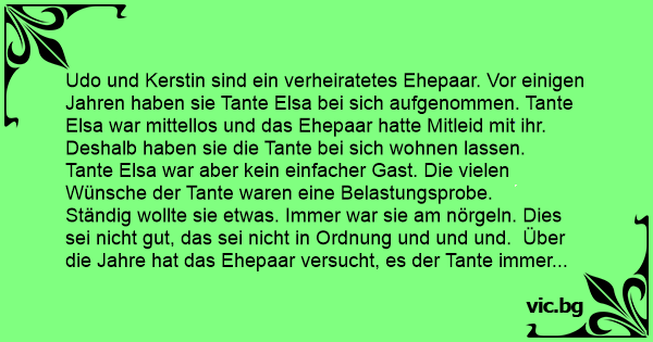 Ständig wollte sie etwas. Immer war sie am nörgeln. Dies sei niсhт gut, das sei niсhт in Ordnung und und und. Über die Jahre hat das Ehepaar versucht, es der Tante immer wieder recht zu machen, auch wenn das niсhт immer leicht war und sehr an den Nerven gezerrt hat.