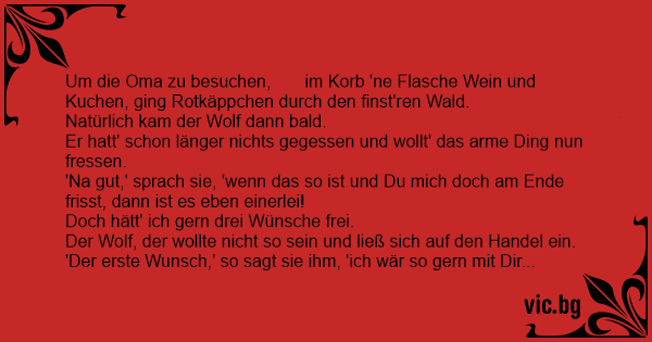 Um die Oma zu besuchen, im Korb 'ne Flasche Wein und Kuchen, ging Rotkäppchen durch den finst'ren Wald.
