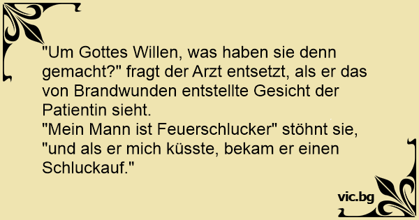 "Mein Mann ist Feuerschlucker" stöhnt sie, "und als er mich küsste, bekam er einen Schluckauf."