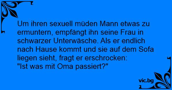 In einer Psychotherapiestunde hatte eine Patientin sich vorgenommen, ihren sexuell müden Mann dadurch zu ermuntern, dass sie ihn in schwarzer Unterwäsche empfing. In der nächsten Stunde berichtete sie: "Mein Mann kommt nach Hause, sieht mich mit der schwarzen Unterwäsche auf dem Sofa und sagt...