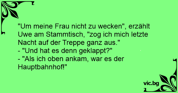 "Um meine Frau niсhт zu wecken", erzählt Uwe am Stammtisch, "zog ich mich letzte Nacht auf der Treppe ganz aus."