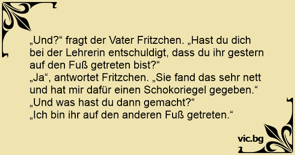 „Und?“ fragt der Vater Fritzchen. „Hast du dich bei der Lehrerin entschuldigt, dass du ihr gestern auf den Fuß getreten bist?“