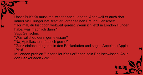 Unser BuKaKo muss mal wieder nach London. Aber weil er auch dort immer viel Hunger hat, fragt er vorher seinen Freund Genscher: