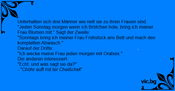 Unterhalten sich drei Männer wie nett sie zu ihren Frauen sind. "Jeden Sonntag morgen wenn ich Brötchen hole, bring ich meiner Frau Blumen mit." Sagt der Zweite: