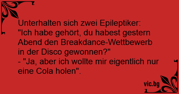 Zwei Epileptiker unterhalten sich: "Ich habe gehört, du hast gestern abend in der Disco den Breakdance-Wettbewerb gewonnen?