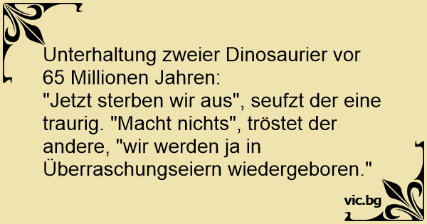"Jetzt sterben wir aus", seufzt der eine traurig. "Macht nichts", tröstet der andere, "wir werden ja in Überraschungseiern wiedergeboren."