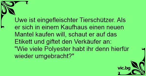 Uwe ist eingefleischter Tierschützer. Als er sich in einem Kaufhaus einen neuen Mantel kaufen will, schaut er auf das Etikett und giftet den Verkäufer an: