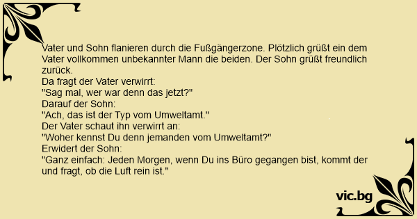 Vater und Sohn flanieren durch die Fußgängerzone. Plötzlich grüßt ein dem Vater vollkommen unbekannter Mann die beiden. Der Sohn grüßt freundlich zurück.