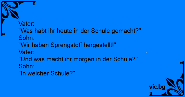 Schule. Fritzchen erzählt daheim: „Heute haben wir in der Schule Sprengstoff hergestellt“. Mama: „So, und was macht ihr morgen in der Schule“? Fritzchen: „Welche Schule“?