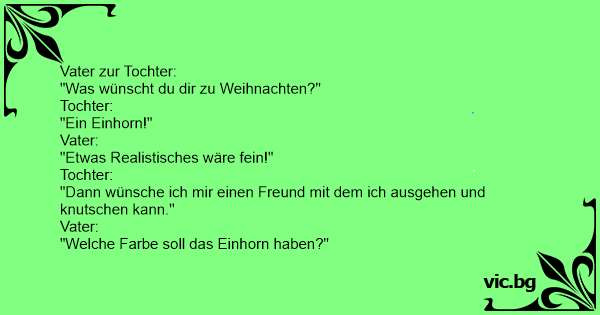 Tochter: „ Papa Papa, ich wünsche mir zu Weihnachten ein Einhorn.“ Vater: „ Sei doch bitte realistisch, Schatz.“ Tochter: „Dann will ich die wahre Liebe finden.“ Vater: „Welche Farbe soll denn dein...