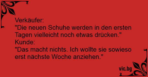 Verkoopster: "De eerste dagen zullen de schoenen wel een beetje knellen." Klant: "Geeft niet, Ik doe ze toch pas over een week aan!"