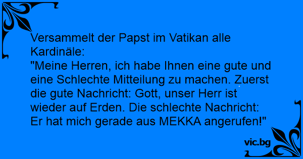 "Meine Herren, ich habe Ihnen eine gute und eine Schlechte Mitteilung zu machen. Zuerst die gute Nachricht: Gott, unser Herr ist wieder auf Erden. Die schlechte Nachricht: Er hat mich gerade aus MEKKA angerufen!"
