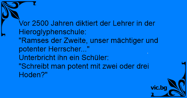 Ramses al II-lea castiga o mare batalie. Evident, isi cheama scribul pentru a imortaliza momentul si incepe sa dicteze: - Eu, Ramses al II-lea... Scribul incepe si el sa picteze hieroglife. - Cel...