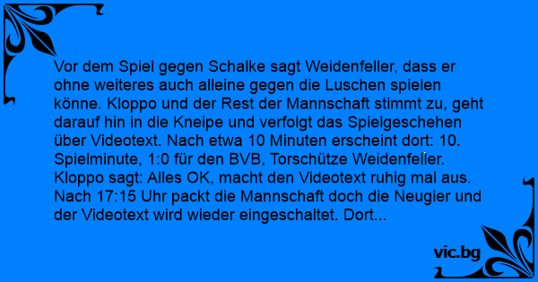 Vor dem Spiel gegen Schalke sagt Weidenfeller, dass er ohne weiteres auch alleine gegen die Luschen spielen könne. Kloppo und der Rest der Mannschaft stimmt zu, geht darauf hin in die Kneipe und verfolgt das Spielgeschehen über Videotext. Nach etwa 10 Minuten erscheint dort: 10. Spielminute, 1:0 für den BVB, Torschütze Weidenfeller. Kloppo sagt: Alles OK, macht den Videotext ruhig mal aus. Nach 17:15 Uhr packt die Mannschaft doch die Neugier und der Videotext wird wieder eingeschaltet. Dort steht: Endstand BVB - Schalke 1:1, Torschütze Kuranyi, 90. Spielminute. Die Mannschaft kann sich das gar niсhт erklären und ist völlig fertig. Ein Unentschieden gegen Schalke, wie peinlich. Plötzlich kommt Weidenfeller in die Kneipe und sagt: