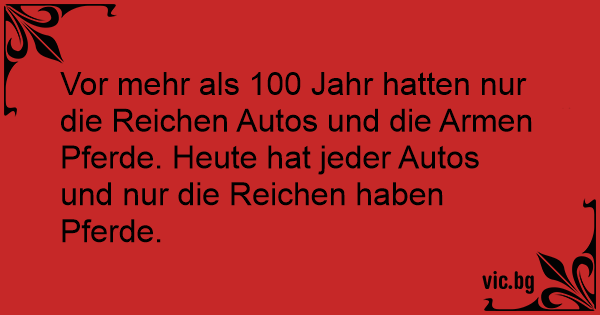 Vor mehr als 100 Jahr hatten nur die Reichen Autos und die Armen Pferde. Heute hat jeder Autos und nur die Reichen haben Pferde.