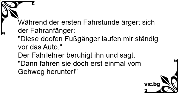 Žmona, sėdinti prie vairo, sako vyrui: - Tas pėsčiasis turbūt savižudis. Jis jau pusę valandos bėga priešais mano mašiną. Ką daryti? - Brangioji, grįžk nuo šaligatvio į važiuojamąją kelio dalį.