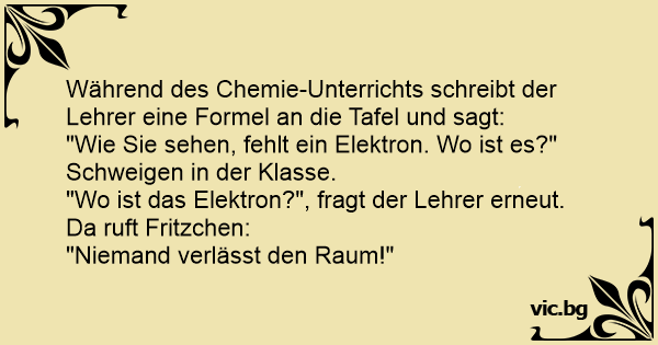Während des Chemie-Unterrichts schreibt der Lehrer eine Formel an die Tafel und sagt: "Wie Sie sehen, fehlt ein Elektron. Wo ist es?" Schweigen in der Klasse. "Wo ist das Elektron?", fragt der Lehrer erneut. Da ruft Fritzchen: "Niemand verlässt den Raum!"