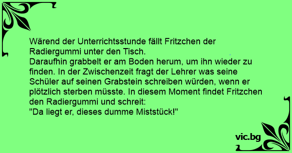 Daraufhin grabbelt er am Boden herum, um ihn wieder zu finden. In der Zwischenzeit fragt der Lehrer was seine Schüler auf seinen Grabstein schreiben würden, wenn er plötzlich sterben müsste. In diesem Moment findet Fritzchen den Radiergummi und schreit: