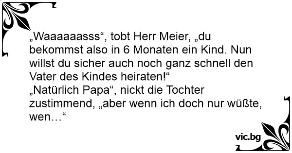 „Waaaaaasss“, tobt Herr Meier, „du bekommst also in 6 Monaten ein Kind. Nun willst du sicher auch noch ganz schnell den Vater des Kindes heiraten!“