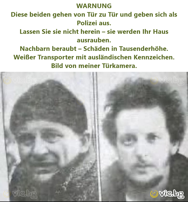 ВНИМАНИЕ Тези двамата обикалят и звънят по вратите, като се представят за полиция. Не ги пускайте вътре – след това ще ви обират къщата. Обрали са съседи – щети за хиляди. Бял бус с чужди номера....