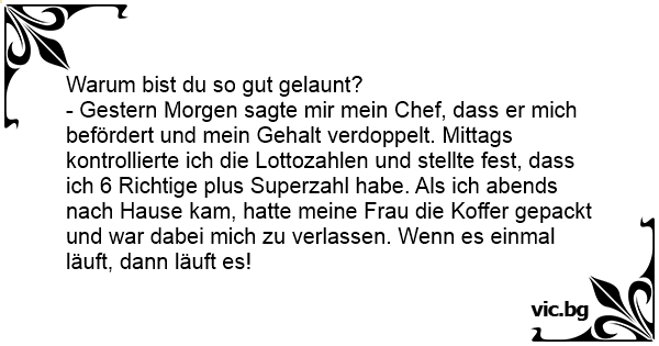 - Gestern Morgen sagte mir mein Chef, dass er mich befördert und mein Gehalt verdoppelt. Mittags kontrollierte ich die Lottozahlen und stellte fest, dass ich 6 Richtige plus Superzahl habe. Als ich abends nach Hause kam, hatte meine Frau die Koffer gepackt und war dabei mich zu verlassen. Wenn es einmal läuft, dann läuft es!