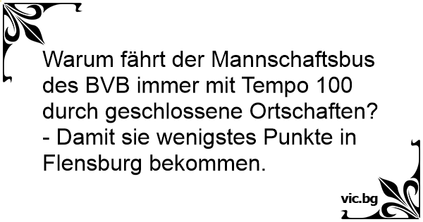 Warum fährt der Mannschaftsbus des BVB immer mit Tempo 100 durch geschlossene Ortschaften? - Damit sie wenigstes Punkte in Flensburg bekommen.