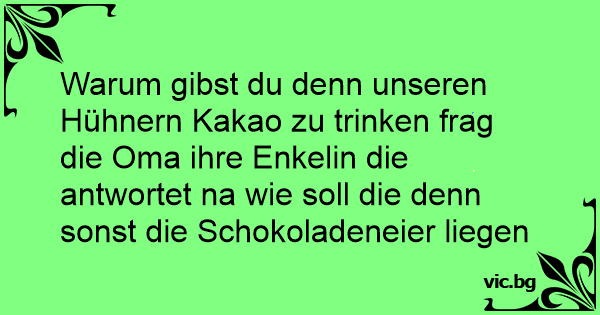Warum gibst du denn unseren Hühnern Kakao zu trinken frag die Oma ihre Enkelin die antwortet na wie soll die denn sonst die Schokoladeneier liegen