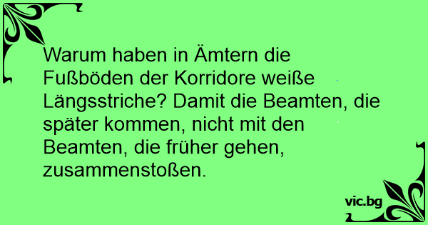 Warum haben in Ämtern die Fußböden der Korridore weiße Längsstriche? Damit die Beamten, die später kommen, niсhт mit den Beamten, die früher gehen, zusammenstoßen.