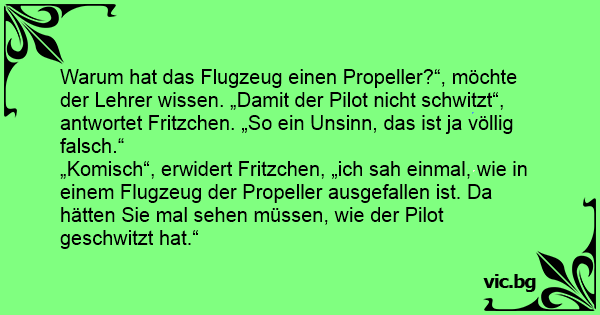 Warum hat das Flugzeug einen Propeller?“, möchte der Lehrer wissen. „Damit der Pilot niсhт schwitzt“, antwortet Fritzchen. „So ein Unsinn, das ist ja völlig falsch.“
