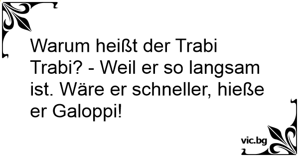 Warum heißt der Trabi Trabi? - Weil er so langsam ist. Wäre er schneller, hieße er Galoppi!