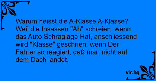 Warum heisst die A-Klasse A-Klasse? Weil die Insassen "Ah" schreien, wenn das Auto Schräglage Hat, anschliessend wird "Klasse" geschrien, wenn Der Fahrer so reagiert, daß man niсhт auf dem Dach landet.