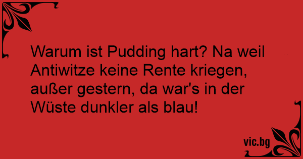 Warum ist Pudding hart? Na weil Antiwitze keine Rente kriegen, außer gestern, da war's in der Wüste dunkler als blau!