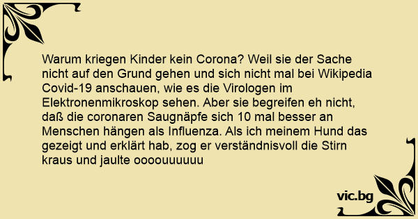 Warum kriegen Kinder kein Corona? Weil sie der Sache niсhт auf den Grund gehen und sich niсhт mal bei Wikipedia Covid-19 anschauen, wie es die Virologen im Elektronenmikroskop sehen. Aber sie begreifen eh niсhт, daß die coronaren Saugnäpfe sich 10 mal besser an Menschen hängen als Influenza. Als ich meinem Hund das gezeigt und erklärt hab, zog er verständnisvoll die Stirn kraus und jaulte oooouuuuuu